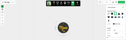 Wie im Bild oben zu sehen, können Sie Ihrer Kreativität freien Lauf lassen, indem Sie Ihren bevorzugten Text, z. B. „Minnie“, zusammen mit verspielten Elementen wie Pfotenabdrücken eingeben, auf die Sie über die integrierte Formenbibliothek zugreifen können. Die Farbanpassung verstärkt die persönliche Note noch weiter und ermöglicht es Ihnen, Ihr fertiges Design entweder als .3mf- oder .stl-Datei zu exportieren, die sich perfekt für den 3D-Druck eignet.