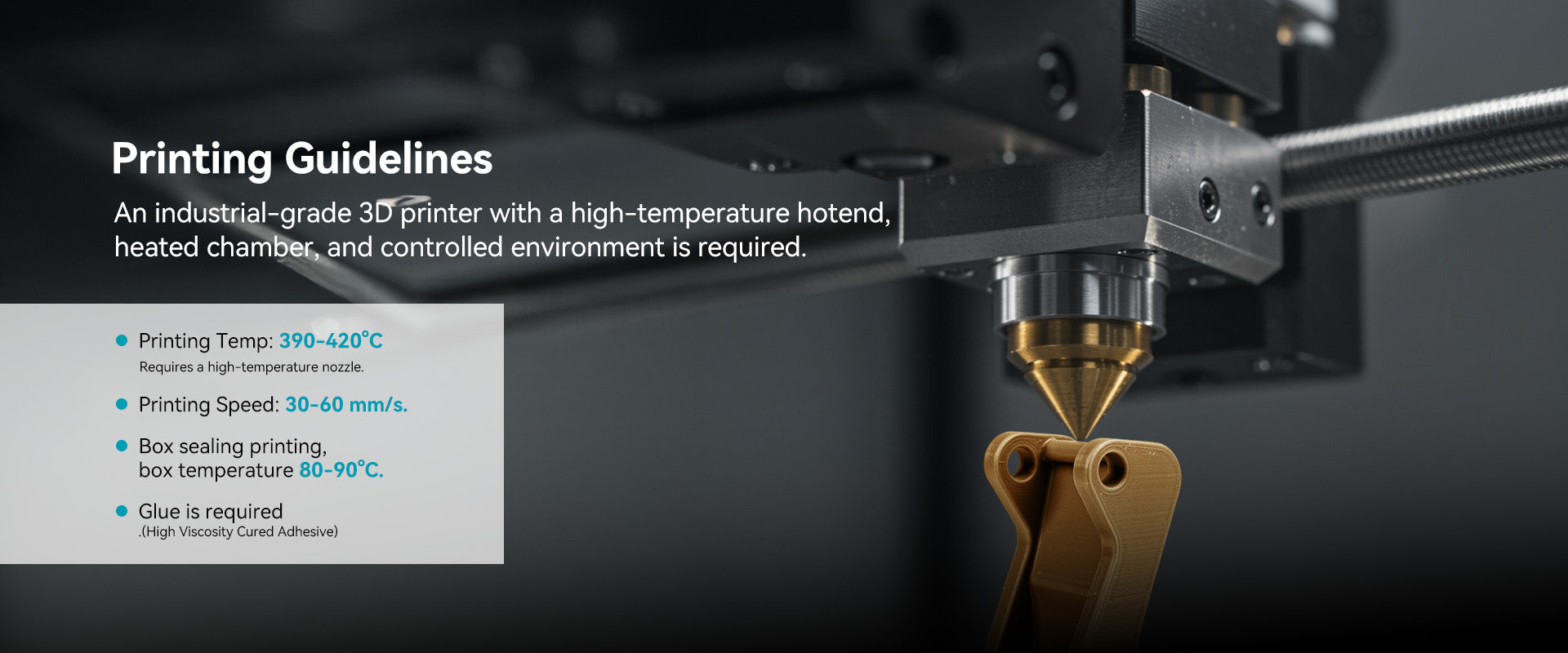 An industrial-grade 3D printer with a high-temperature hotend, heated chamber, and controlled environment is required.