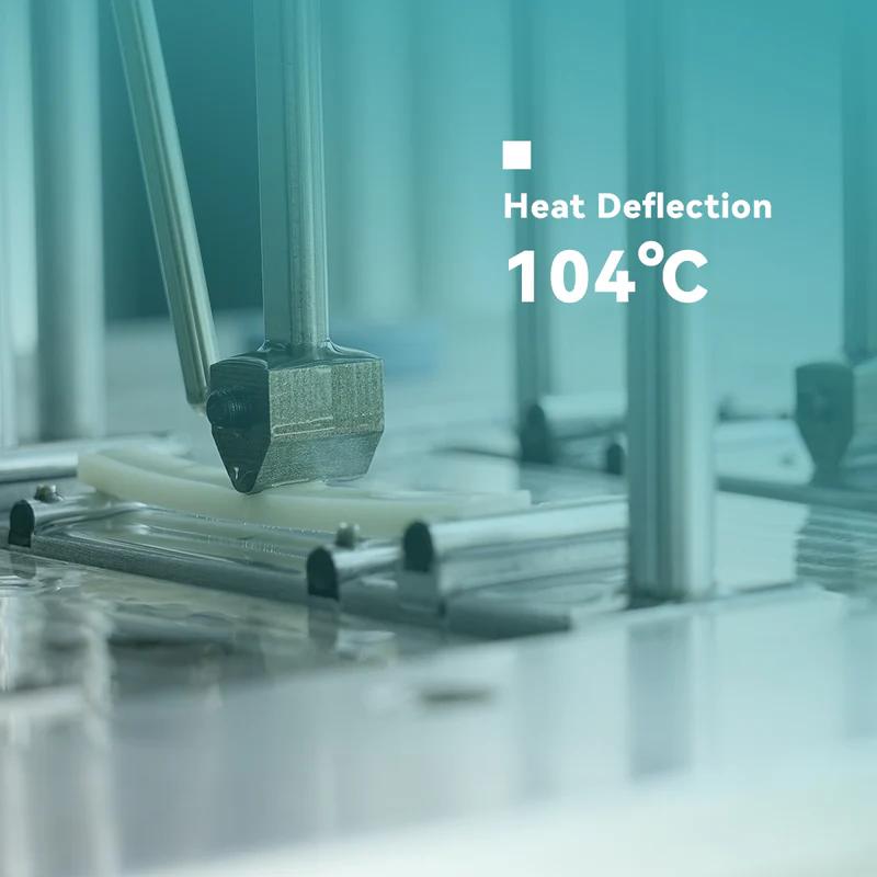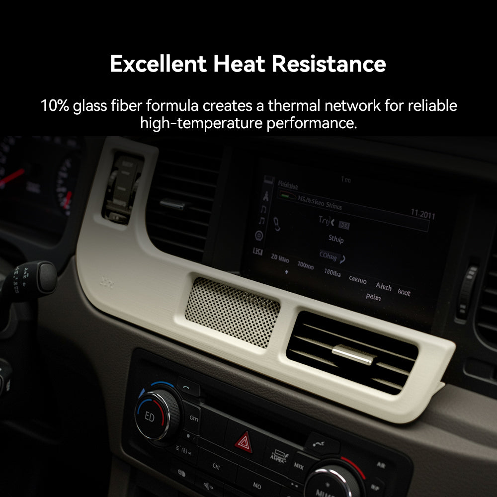 The 10% glass fiber filler forms a thermal conduction network, slowing internal temperature rise by 30% and significantly increasing the heat deflection temperature. Ideal for high-temperature applications (e.g., automotive parts, functional prototypes).