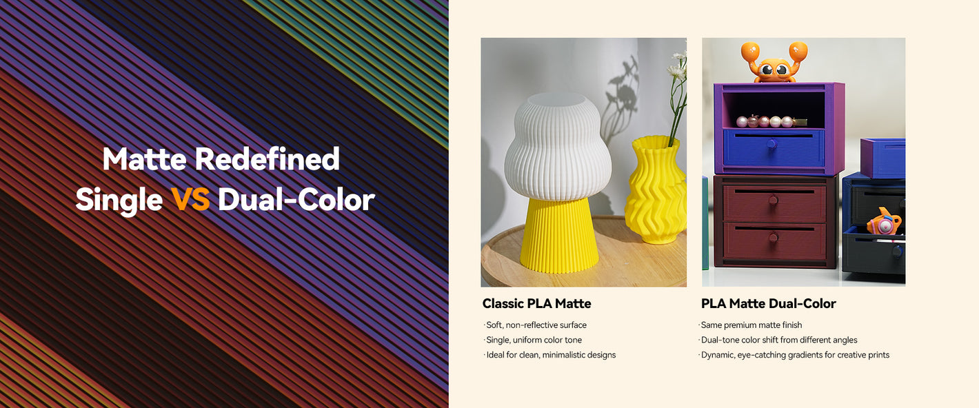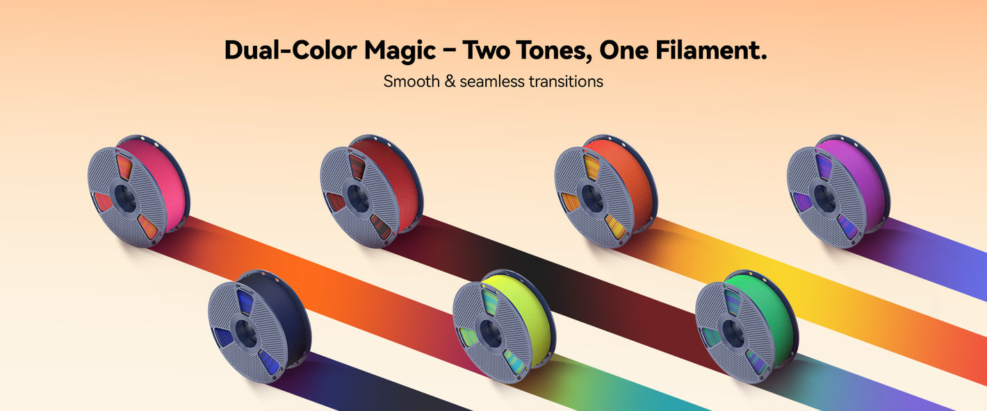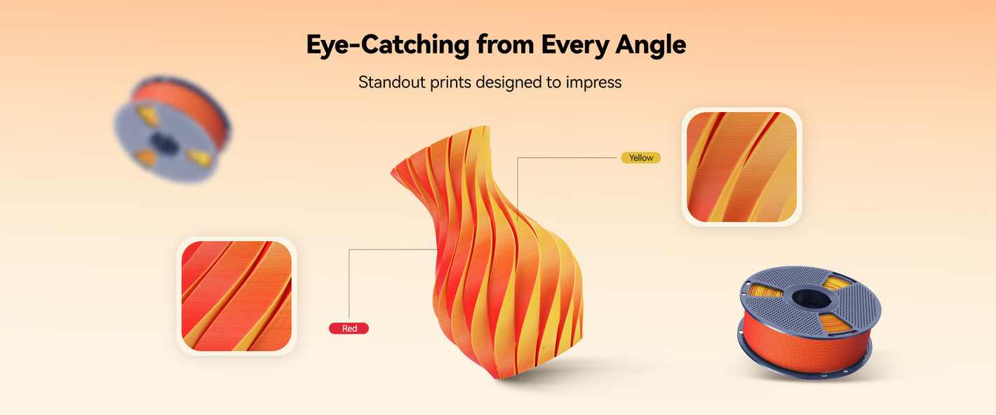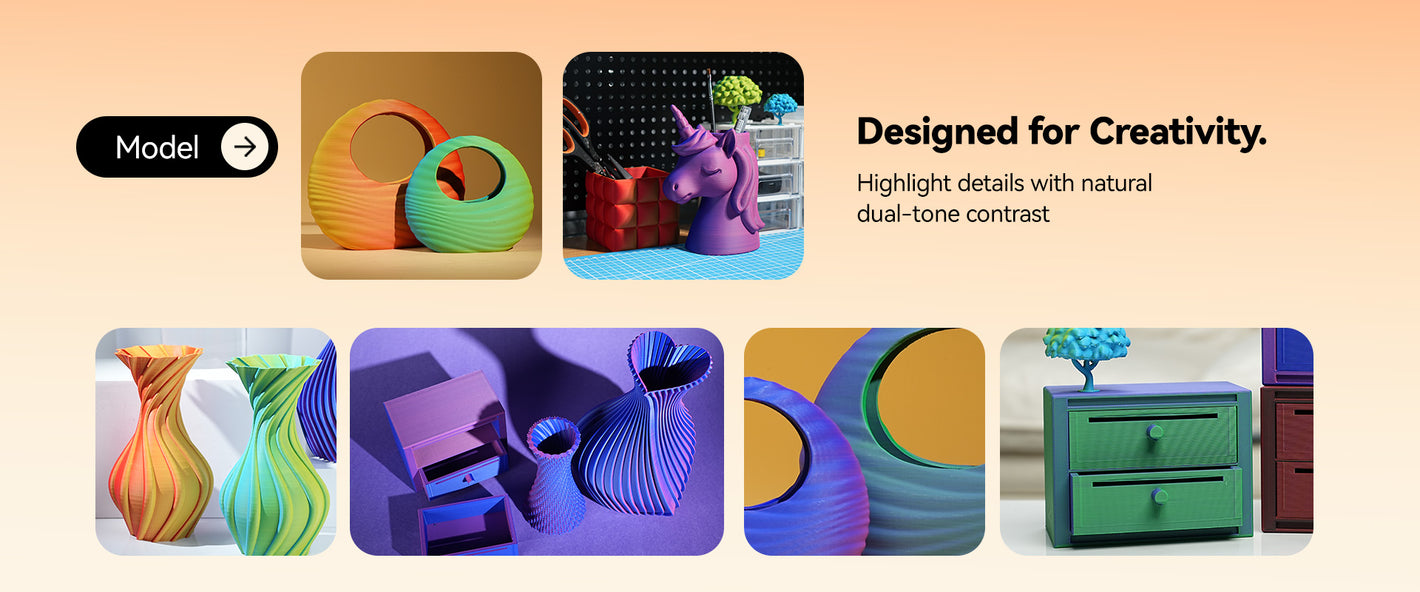 The filament produces a naturally soft, non-reflective surface that eliminates glare. Perfect for artistic and decorative prints where a sophisticated matte texture enhances the overall design.Enjoy two distinct colors in a single filament. Different surfaces of the model reveal different tones, creating smooth, natural transitions—ideal for unique accessories, decorative art, and personalized models.