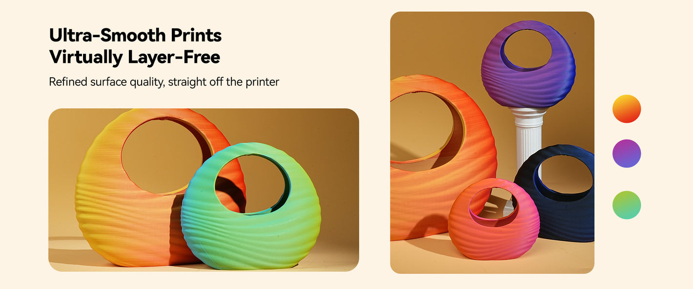 The color blending is smooth and seamless, with no harsh lines between tones, giving models a refined and professional aesthetic. Designed for ultra-smooth extrusion, this filament reduces visible layer lines and delivers a polished finish straight off the printer, minimizing post-processing work.