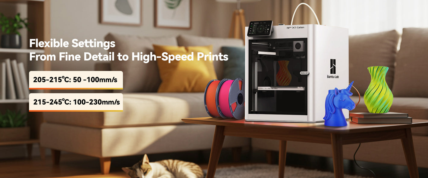 Compatible with a broad temperature range (205–215°C) and speeds (50–100mm/s)、(215–245°C) and speeds (100–230mm/s) Whether printing detailed models at slow speed or larger projects at high speed, the results stay stable and smooth. Glue-free adhesion on heated beds (50–60°C). For non-heated beds, a thin layer of glue is recommended for strong first-layer bonding.