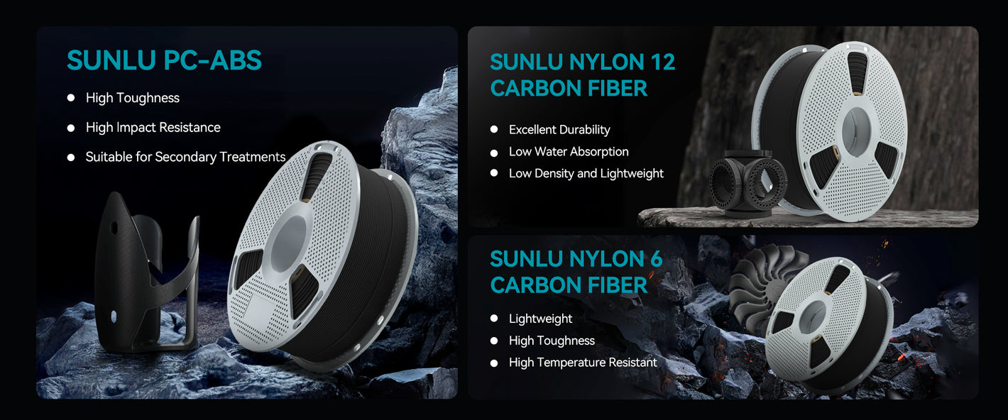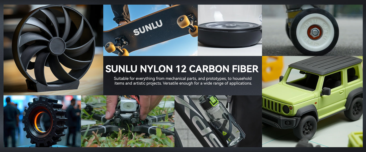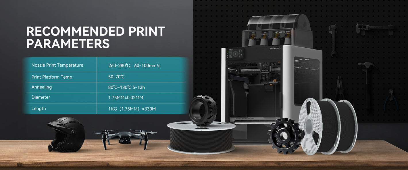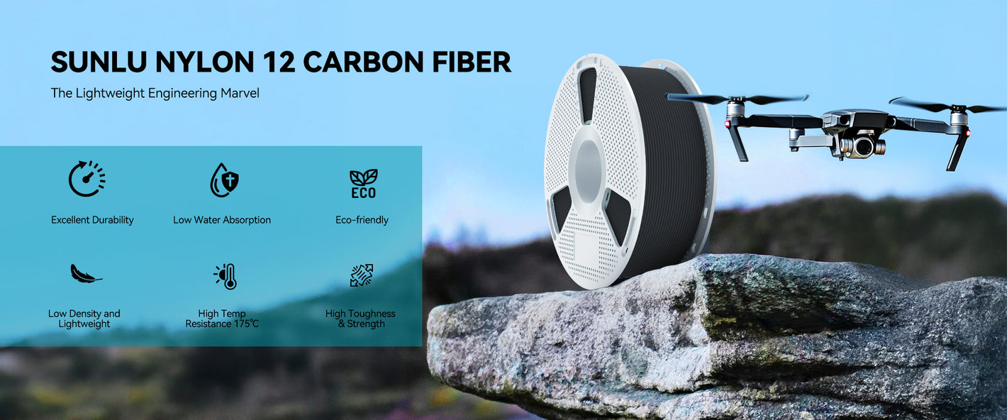Engineered with carbon fiber reinforcement, SUNLU’s PA12-CF withstands temperatures up to 176°C, ensuring stability in demanding environments like automotive or aerospace applications. Optimized for printing at 260–280°C with a 50–70°C heated bed (use adhesive for adhesion), it delivers reliable performance even under extreme thermal stress.