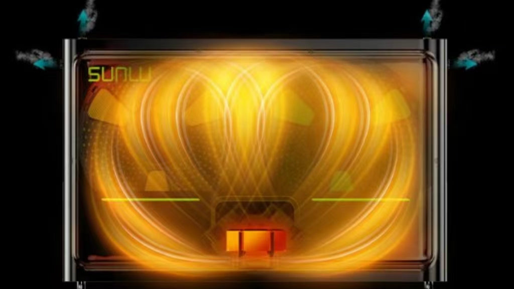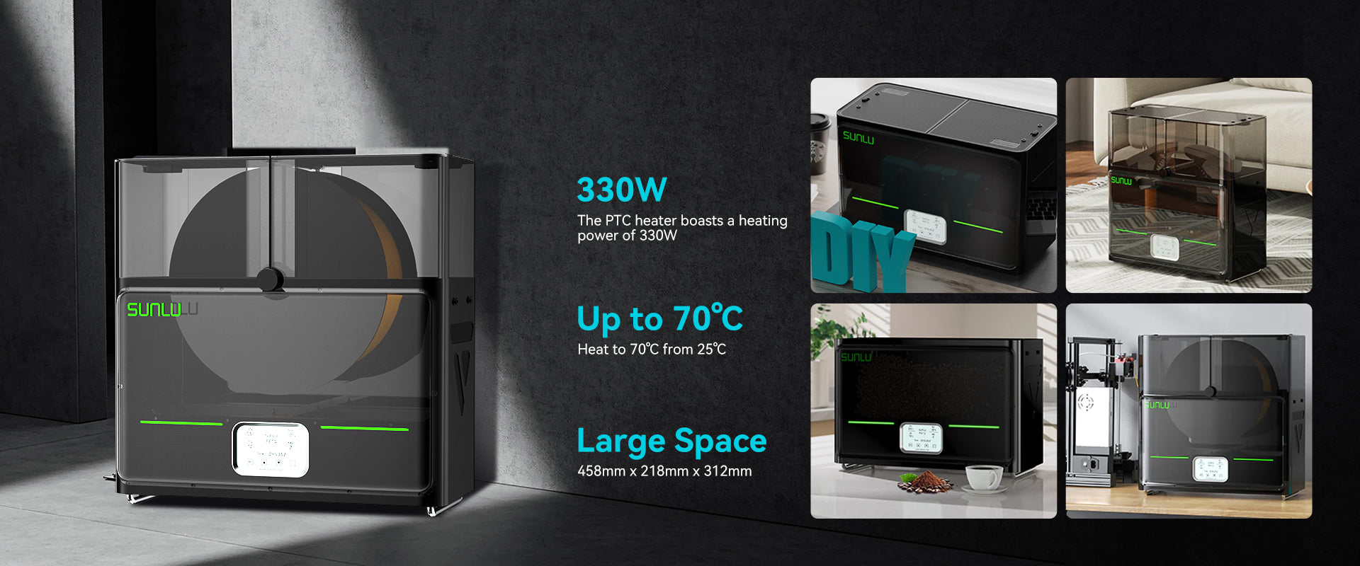 SUNLU FilaDryer S4 is equipped with the PTC heating element and a triple-fanconfiguration and therefore it demonstrates enhanced heating efficiency bybeing able to heat up to 70'C in a shorter amount of time. The PTC heater boastsa heating power of 330W, a 6.9X a increase compared to that of SUNLU FilaDryer S2. -