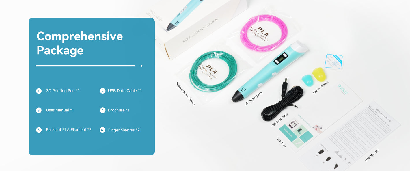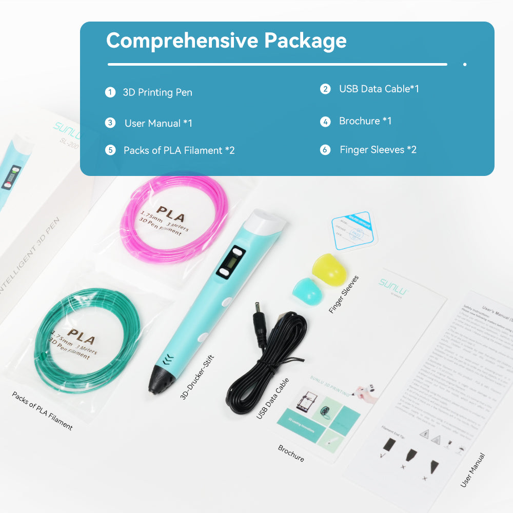 Your SL-200 package includes everything you need to start creating immediately: the pen itself, a power adapter (EU, US, UK standards available), a USB data cable, a user manual, a brochure, two packs of PLA filament, and two finger sleeves. The product is ROHS, FCC, and CE certified, ensuring top-notch quality and safety.