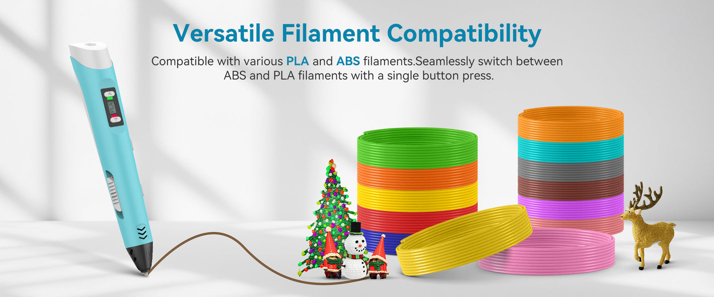 This 3D printing pen is compatible with both PLA and ABS filaments (1.75±0.02mm). Switch between different materials effortlessly with a one-press material swap feature for diverse creative projects. Recommended temperature settings are ABS: 180-210℃, and PLA: 160-180℃.