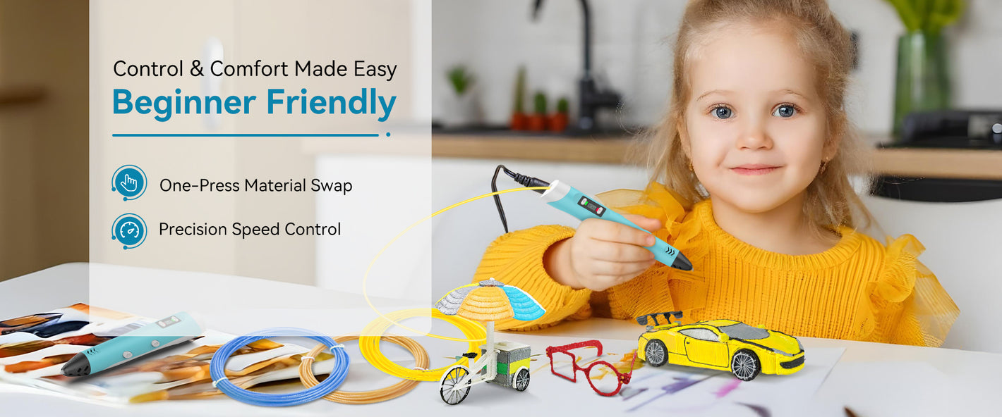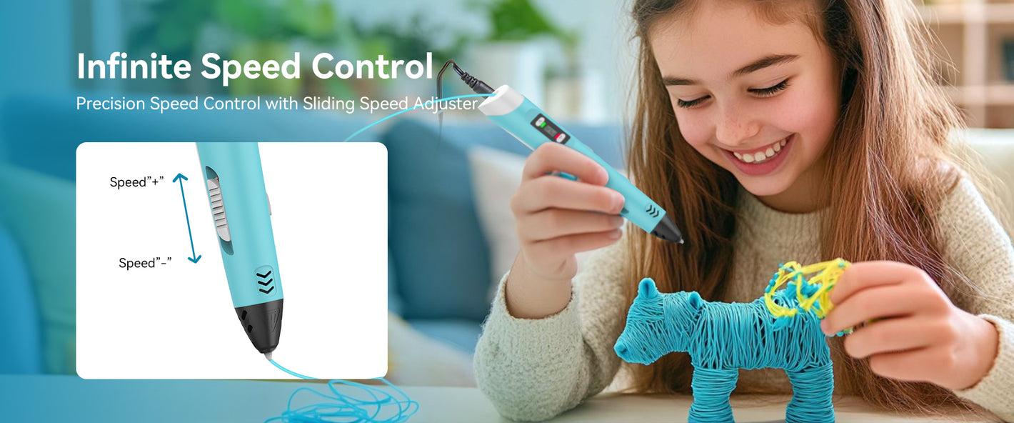 The pen is designed with multiple buttons for easy and intuitive handling. It also includes a front cover with a knob, making maintenance and filament replacement quick and hassle-free. Speed control is made more precise with an adjustable slider, giving you fine-tuned command over your drawing pace.