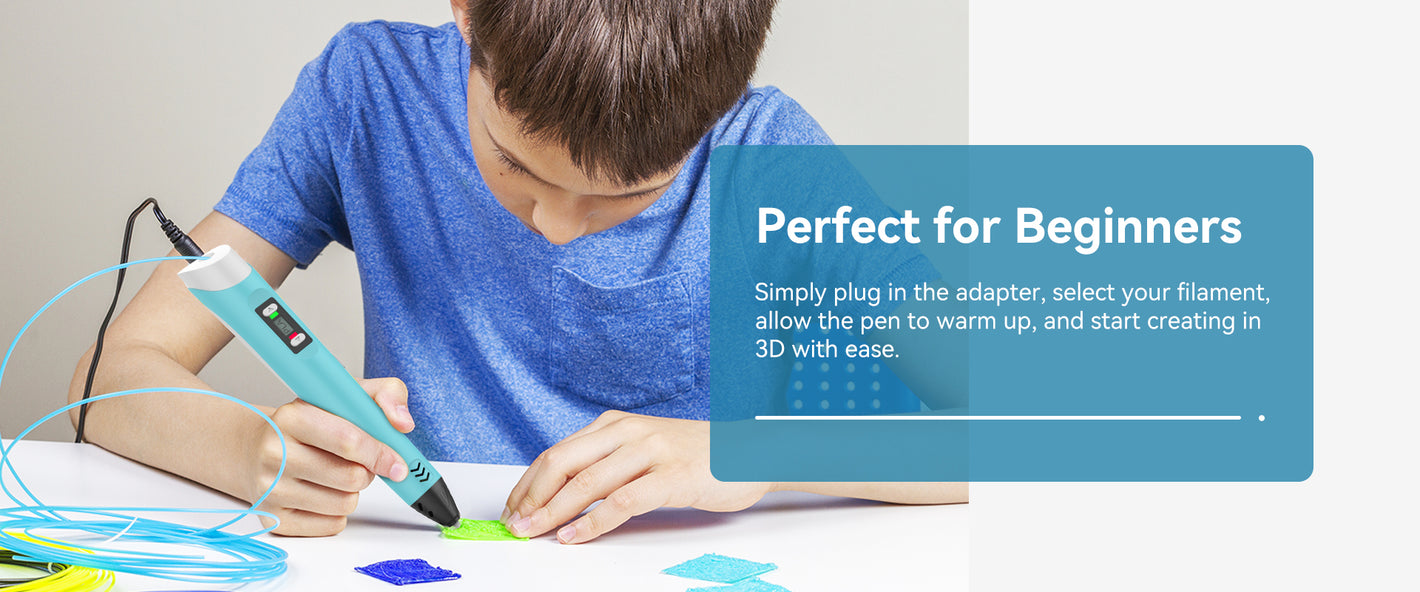 Simply plug in the adapter, select the filament, let the pen warm up, and start creating in 3D with ease!