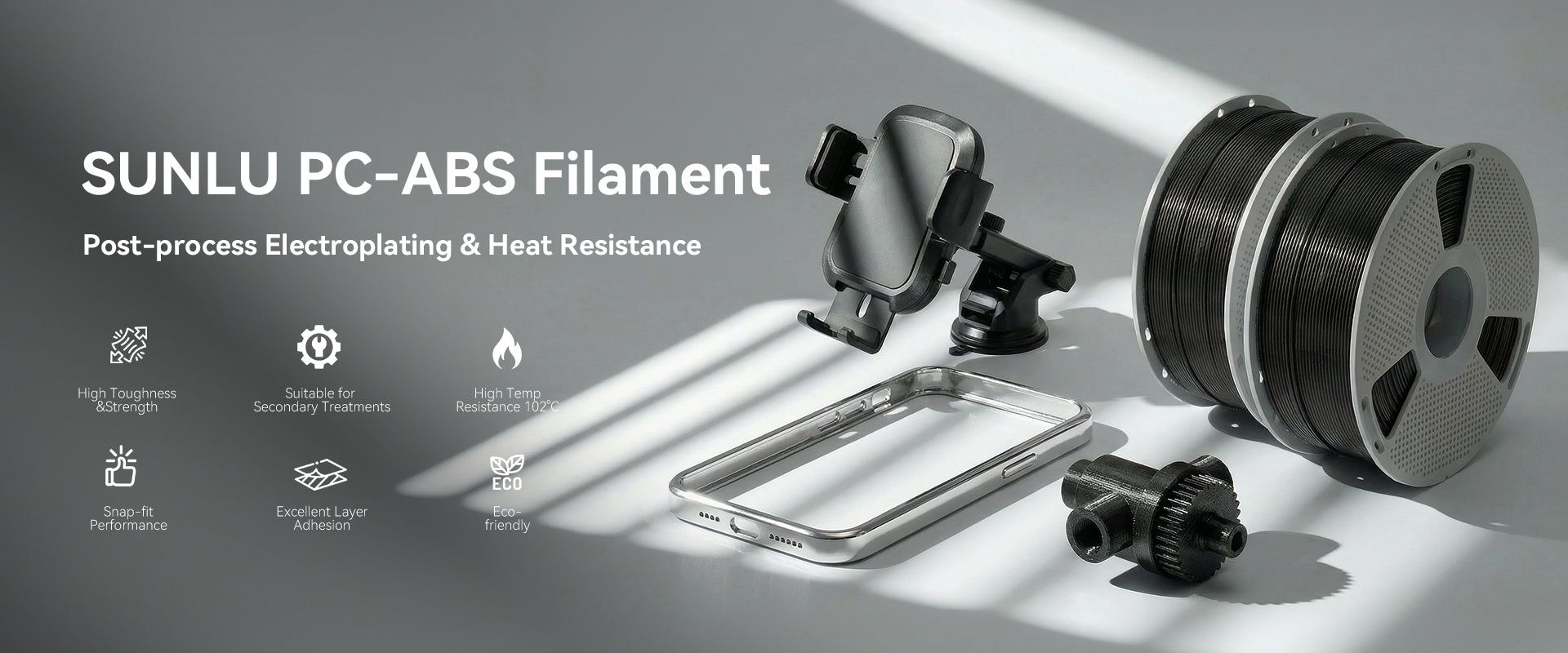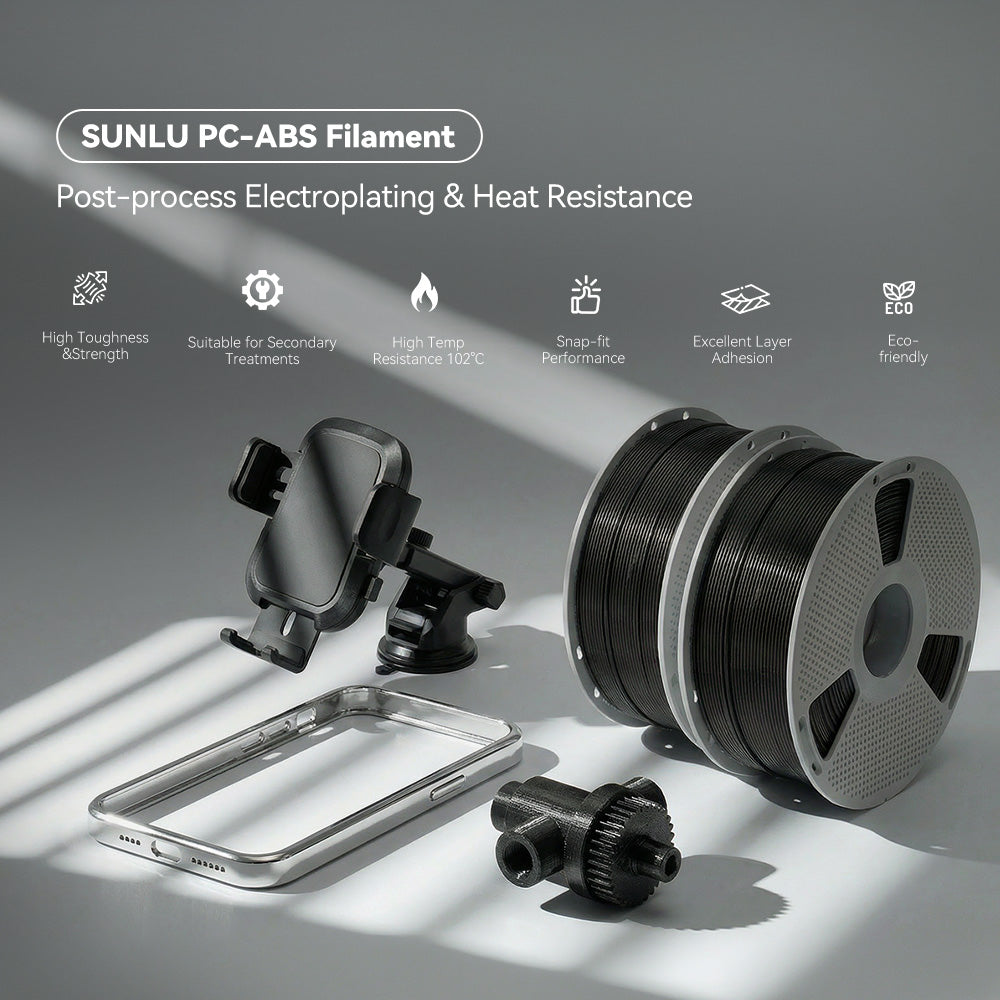 SUNLU PC-ABS Filament is a high-performance 3D printing material made from a polymer alloy of PC (polycarbonate) and ABS (acrylonitrile butadiene styrene). Combining excellent heat resistance and toughness of PC with the enhanced processing capabilities of ABS, printed parts remain stable even under high temperatures and impact. This material also offers a smooth surface finish and is highly compatible with metal coatings, making it ideal for applications that require both strength and aesthetic appeal. Widely used in automotive, electronics, and industrial sectors, PC-ABS delivers high-quality finished products and prototypes.