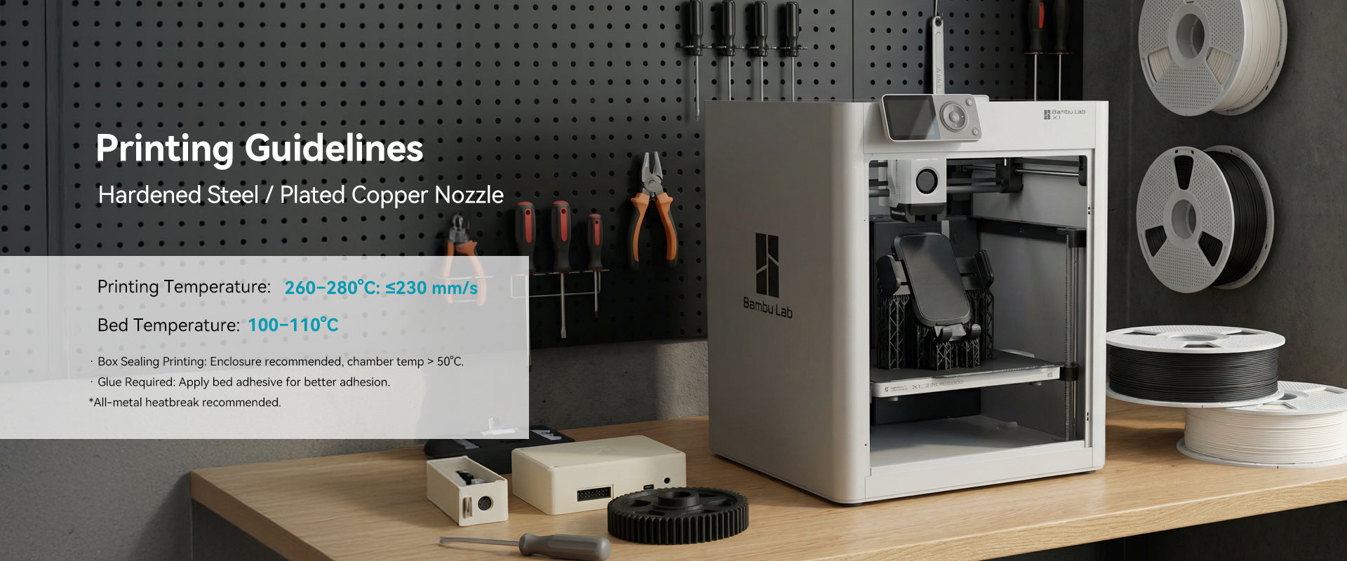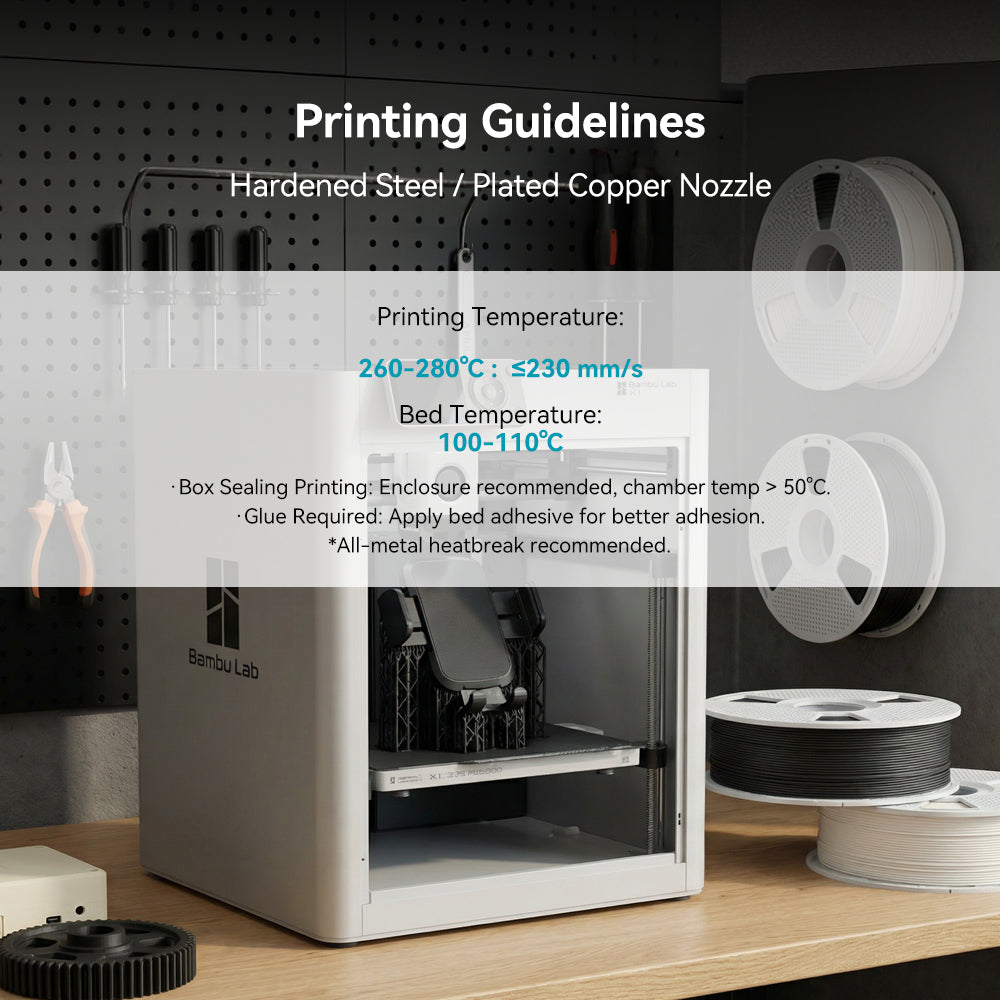 Please note that PC-ABS is industrial engineering filament that need a high printing temperature and chamber Temperature(about 90˚C~100˚C), make sure of your printer's suitability before purchasing.